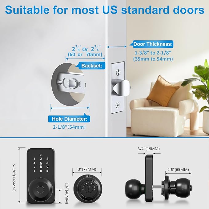 • APP Smart Door Knob: The electronic door lock feathers a nice circular unlock indicator and backlight,simple app allows you to easily program the smart lock and enjoy a smart life,You can use the app to open the door when you get close to the door lock (Bluetooth distance 16FT)