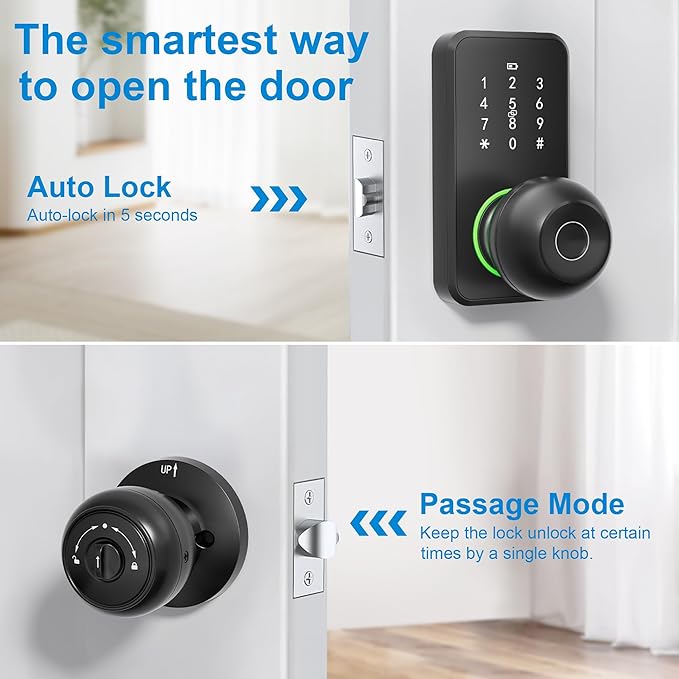 • Fingerprint door knob Lock: You can open the door in 5 ways, include Password,Key Fob,APP,Fingerprint and key,the smart door lock also provides automatic locking function after door opened,you can set the time by app